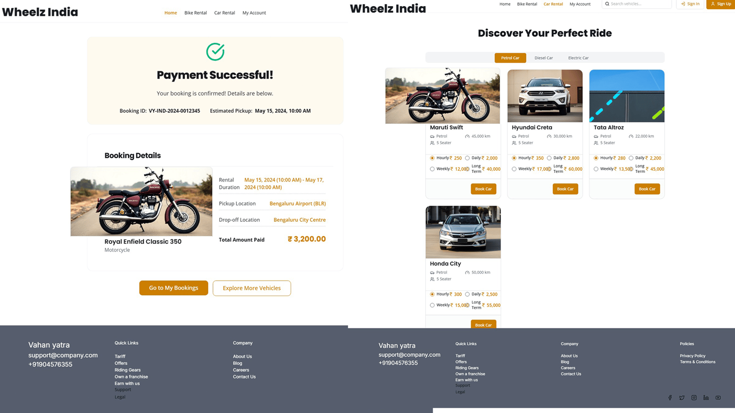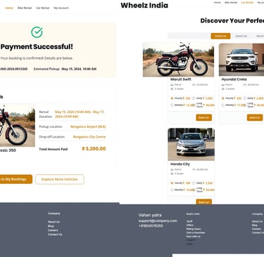 The system includes secure sign-in, sign-up, booking confirmation, payment confirmation, and a personalized account dashboard showing past and active rentals. The design emphasizes Indian visuals, intuitive navigation, and a youthful, travel-friendly look, ensuring a seamless rental experience for customers nationwide